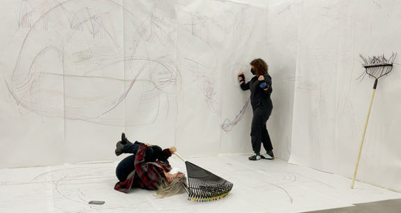 This interactive artwork stemmed from my research on the effects of play on the brain while reading Play: How it Shapes the Brain, Opens the Imagination, and Invigorates the Soul by Stuart L. Brown and Christopher C. Vaughan. According to Brown and Vaughan, play is integral to brain development and creating healthy human connections. With this information, I facilitated a performance titled Play. This performance incorporated various objects and tools I altered into mark-making implements. These objects included elbow and knee pads saturated with crayon, a metal garden rake with markers attached, and a plastic leaf rake with a zigzag handle that supported multi-colored oil pastels. The tools were organized on the floor and walls, and above the implements were two sheets of QR codes. Above the codes were the labels ‘Round One’ and ‘Round Two.’ The performance was held in two rounds; the first round included personal preference, or memory recall prompts on what to render, and the second round included physical prompts on actions to do while drawing. The varying styles of prompts activated various parts of the brain while the participants engaged in play-like activities. While creating this work, I was informed by Karina Smigla-Bobinski, a Polish-German artist, and her artwork, ADA. Our work draws similarities through the creation of new mark-making tools that prompt public participation.